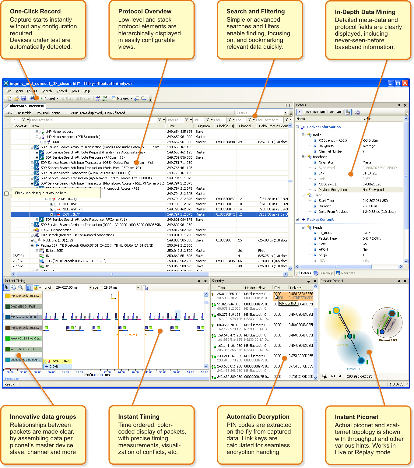 The Explorer’s software application is designed to give the user an immediate understanding of complex traffic and topologies, and provides unique and intuitive features, including Instant Piconet™ and Instant Timing™ views.  The Instant Piconet view provides an iconic, dynamic, and intuitive graphical depiction of piconet and scatternet topologies and activities.  The Instant Timing view provides a graphical, horizontal chronology of all captured traffic, and includes easy timing and throughput measurements with 1/8th symbol precision.  Relationships between protocol layers and sequences are clearly presented and easily understood across multiple synchronized views.