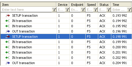 This illustration shows a section of the enumeration of a peripheral. It is possible to specifically distinguish a request made up of six transactions. |